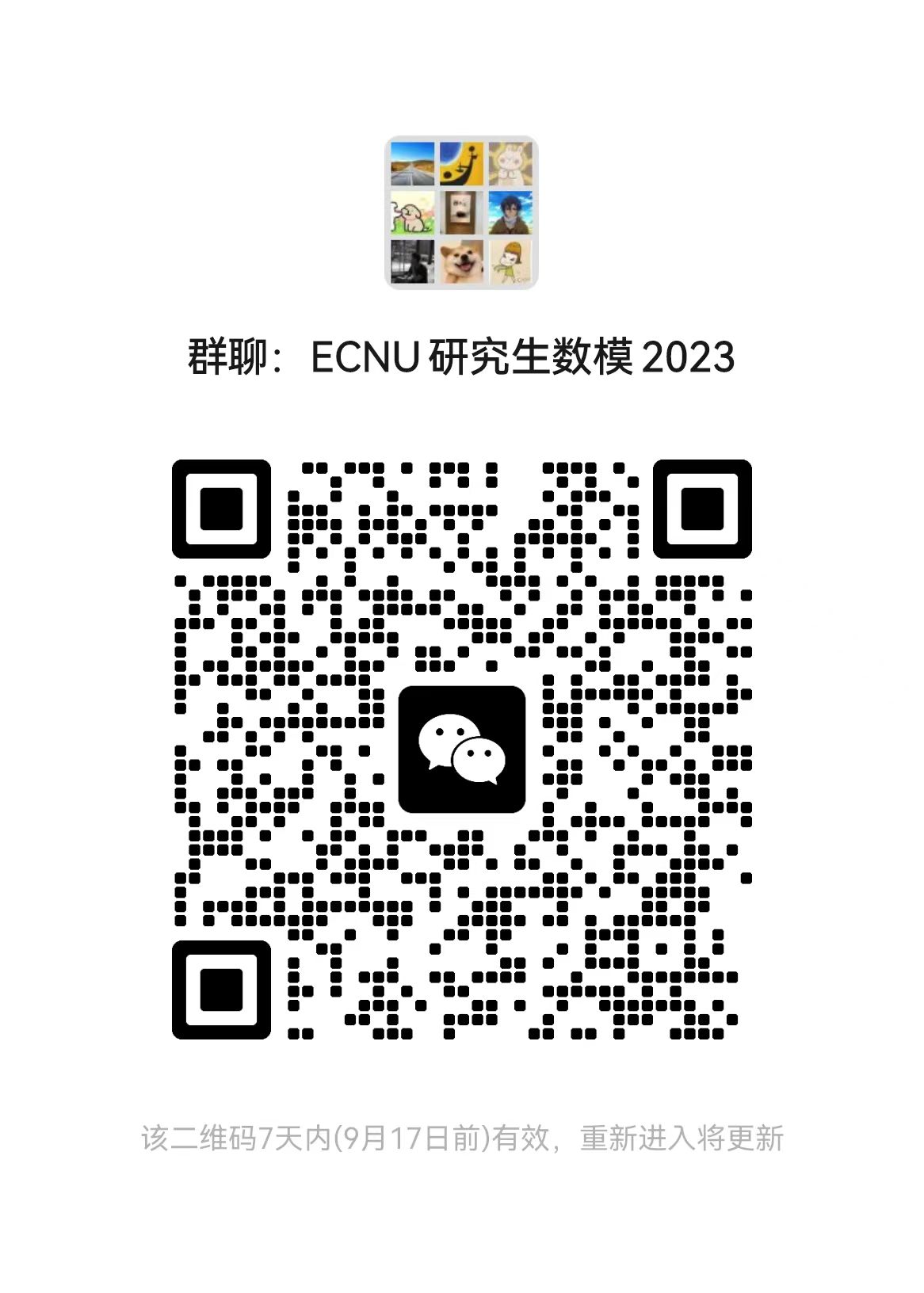 4、请队长扫码加入“ECNU研究生数模2023”微信群(二维码见附件2),跟进大赛流程、讲座培训以及交流咨询。申请添加时,请注明院系+姓名+数模参赛