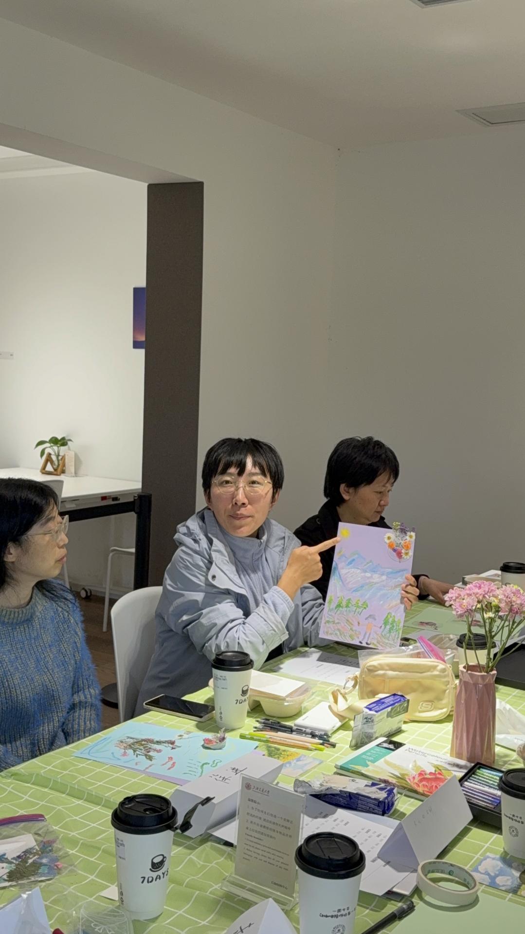 “我画这片蓝色,是因为最近赶报材料有点焦虑,想借这片‘海’让自己静下来。”“看到吴老师捏的泥塑小人,我突然觉得,其实我们都在盼着一点‘不被打扰的时间’。”创作结束后的分享环节,成了整场活动最暖的部分。老师们拿着自己的作品,聊创作时的心情,也聊日常工作里的忙碌与小烦恼。有人说“原来大家都有类似的压力”,有人感慨“从别人的画里,好像看到了自己没说出口的情绪”,还有人借着分享,主动拥抱了自己偶尔的“消极”——“原来承认负面情绪,也是一种勇气”。