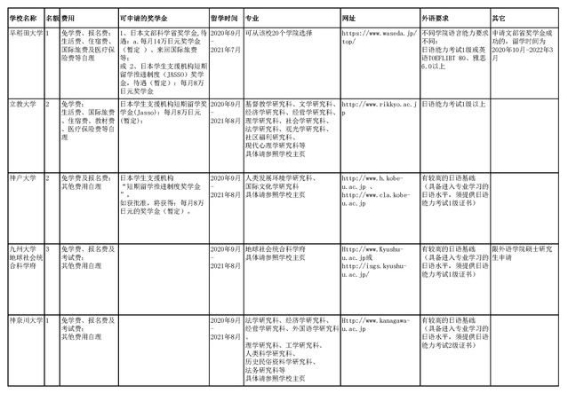 根据我校与日本早稻田大学、立教大学、神户大学、九州大学地球社会统合科学府、神奈川大学等5所高校的交流协议,我校拟选派9名研究生于2020-2021学年赴日本学习。研究生院即日起开始遴选交流研究生人选,现将相关工作通知如下:
