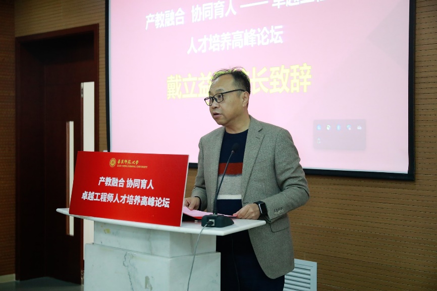 戴立益代表学校向各理事单位领导、行业导师代表、老师们和同学们的到来表示热烈的欢迎。他指出,“卓越育人工程”是我校“三大卓越工程”之一,希望大家充分发挥卓越工程师学院和前沿学科交叉中心等平台的优势,共同探讨卓越工程师的人才培养模式和有效途径,从专业学位建设中汲取经验,从企业和同行的经验中汲取智慧,锚定卓越先行先试,走出教育科技人才一体统筹推进发展的师大新路。