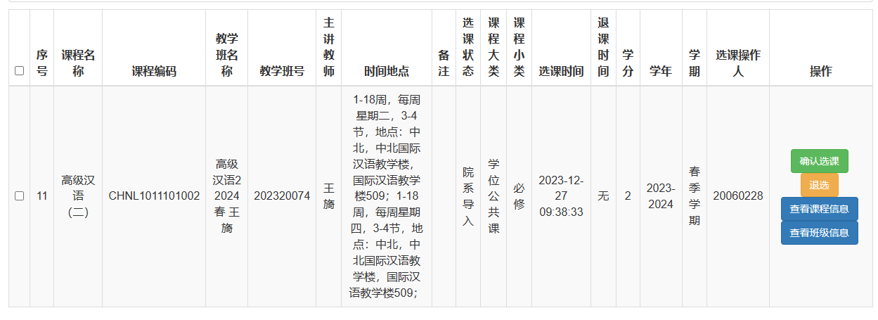 如需退课,在【我的选课结果】页面相应课程后,在有效时间内,可进行【退课】。