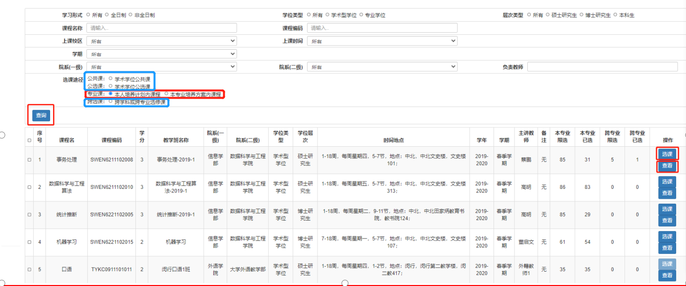 目前除了公共政治课和来华留学研究生公共课采用预选方式(院系导入+学生确认选课)之外,其他课程都鼓励学生自行选课。