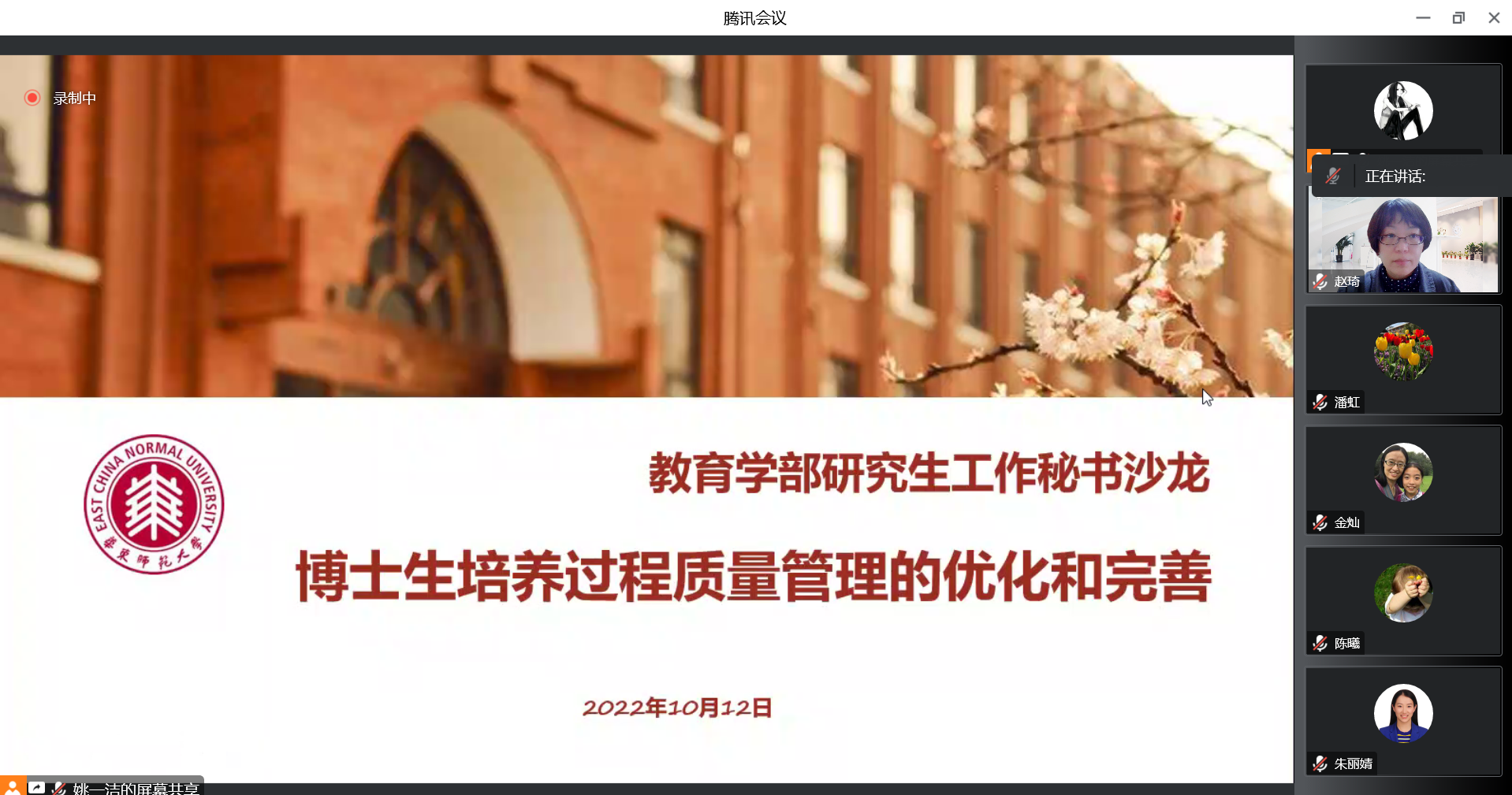 培养环节考核作为博士研究生教育的关键节点,是研究生培养过程管理的重要抓手,也是保证研究生培养质量的重要举措。2022年10月12日,在研究生院的支持下,教育学部以“培养环节考核”为切入点,组织召开“博士生培养过程质量管理的优化和完善”研究生工作秘书沙龙。沙龙邀请研究生院培养办公室崔光秀、河口海岸科学研究院研究生工作秘书金灿、教育学部课程与教学系(研究所)研究生工作秘书朱丽婧三位老师作主题分享,来自教育学部教学事务部、各系所、教师教育学院等单位的16位研究生工作秘书共同参与研讨。沙龙由项目负责人,教育学部教学事务部主任赵琦主持。