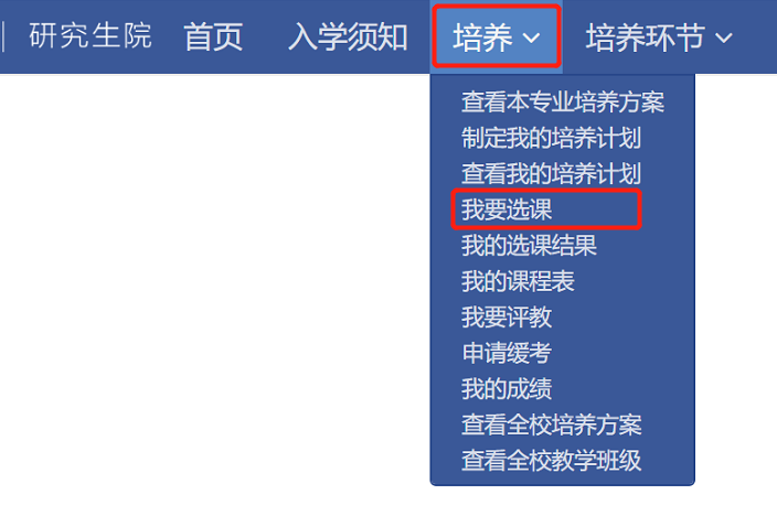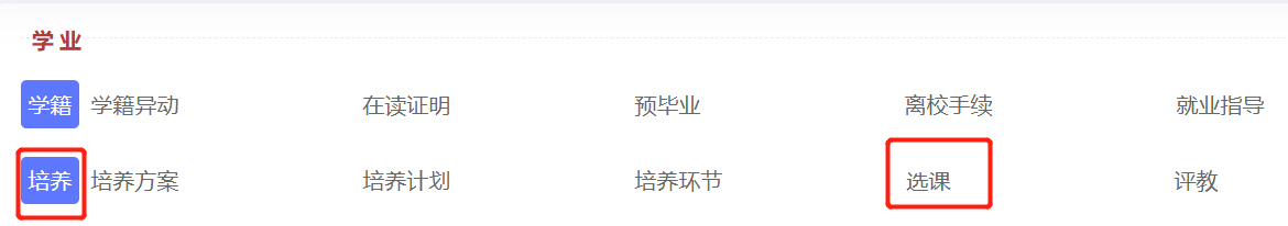 登录公共数据库——找到【学业】模块——点击【培养】中的【选课】——权限点击“学生”,进入新培养系统——点击【培养】下拉菜单中的【我要选课】。
