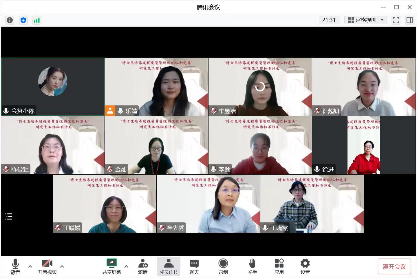 博士研究生是我国经济社会转型的重要推动力量。随着我国产业转型升级和社会经济的快速发展,社会对高质量人才、领军人才的需求更加迫切。为推进博士生教育高质量发展,健全博士生培养质量管理体系,以“博士生培养过程质量管理的优化和完善——博士生分流淘汰机制的实施困境与对策”为主题的研究生工作秘书沙龙于2022年10月21日以腾讯线上会议形式成功举行。河口海岸研究院研究生工作秘书金灿、生态与环境科学学院研究生工作秘书丁媛媛作主要分享,研究生培养办公室崔光秀及来自不同院系的研究工作秘书等10位老师参加研讨会。会议由政治与国际关系学院研究生工作秘书乐靖主持。