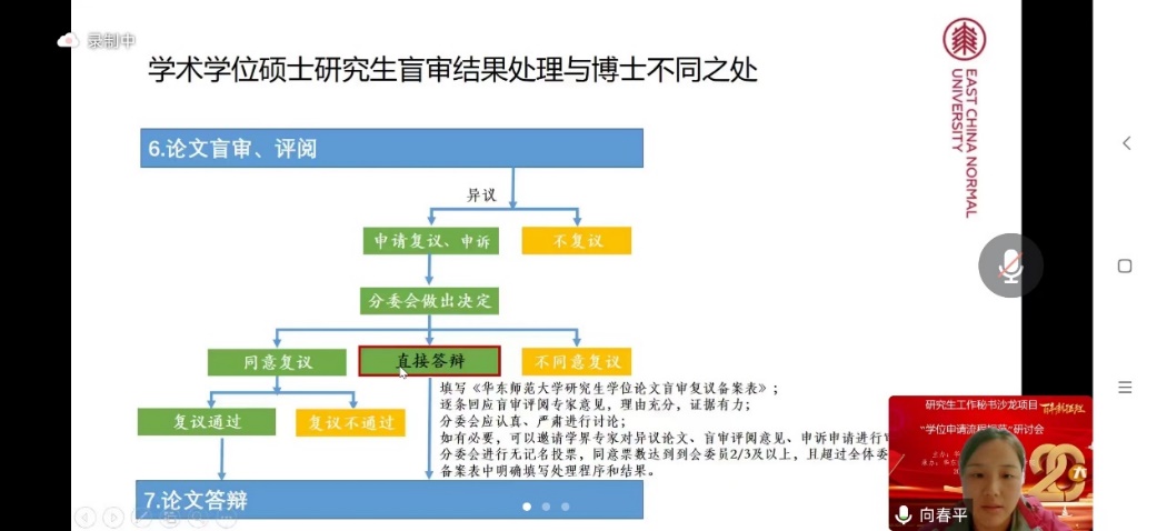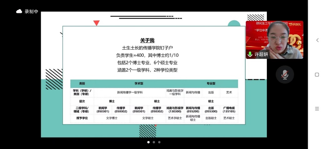 数据科学与工程学院徐佩珺从沟通、统一原则、文件分类等方面分享了在研究生学位申请工作中的经验与总结,还展示了实际面向学生收集各类信息时使用的一些技巧。