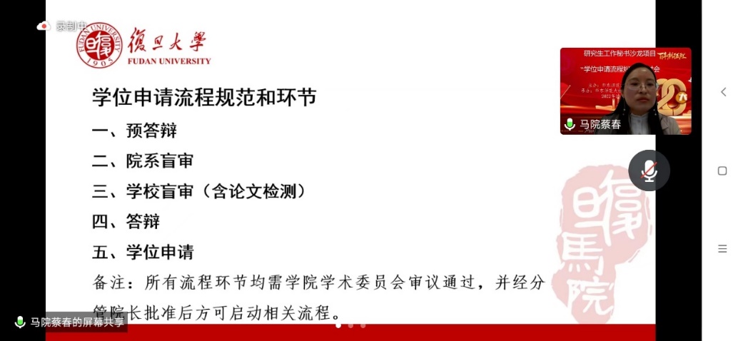 蔡春分享了本校学位申请的流程与环节,从复旦大学学位申请流程的基本情况入手,强调了学院学位工作的原则是严把论文责任关、政治关、选题关、审核关,通过一套较为完善的信息化系统为研究生学位申请工作提效保质,并分享了筹建院内盲审环节的经验与方法。