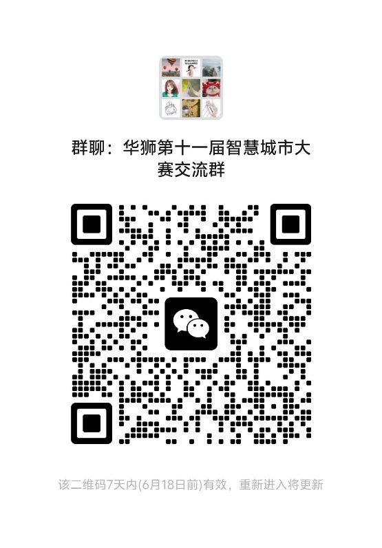 6)交流咨询:请参赛队员扫码,加入微信工作群,跟进大赛流程、讲座培训以及交流咨询。进群后,请注明“院系+姓名+智慧城市参赛”。