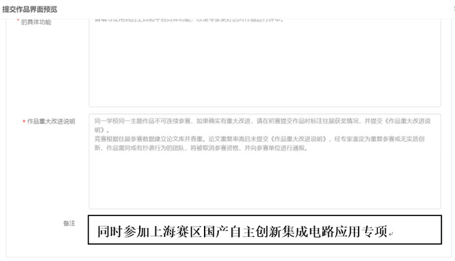 除全国已有的8个参赛方向、全国企业命题方向和上海赛区企业命题方向外,上海赛区今年又新增一附加报名方向,包括:仪器装备专项和国产自主创新集成电路应用(要求参赛作品中国产集成电路占主导地位,组委会有最终解释权)专项。符合相关赛题要求、且有意参加该两项新增专题评选的队伍,请在提交作品界面备注栏里填写:同时参加上海赛区仪器装备(或国产自主创新集成电路应用)专项,示例如下图黑色粗体字所示。