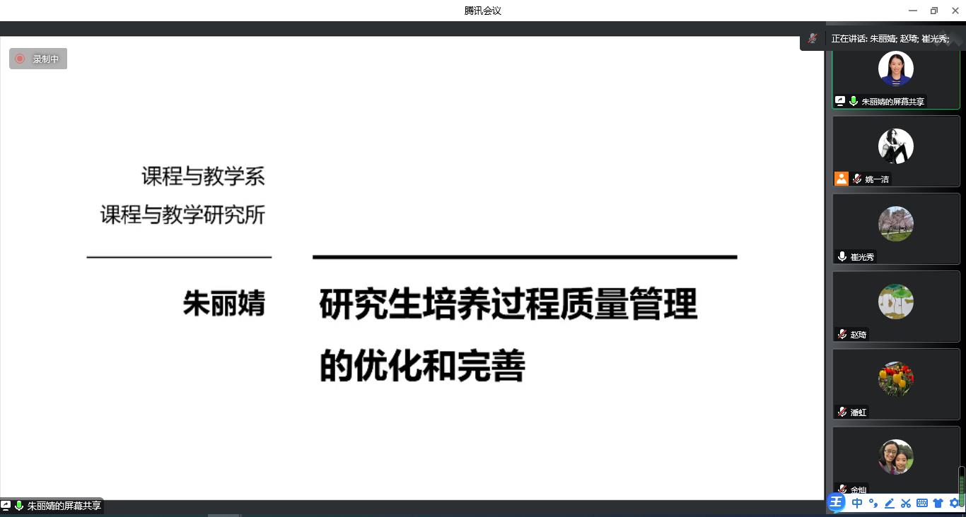 随后,河口海岸科学研究院研究生工作秘书金灿、教育学部课程与教学系(研究所)研究生工作秘书朱丽婧分别从各自工作实际出发,分享了本单位博士研究生培养过程质量管理的特色与成效。金灿重点介绍了河口海岸科学研究院在组织博士生“资格考试”、“开题报告”和“年度报告”的具体做法。他们创新“年度报告”的考核形式,以院系组织研究生学术沙龙的形式开展年度报告考核,针对不同年级分别采用口头报告或海报展示等形式,对于表现优秀的博士生给予奖励。以上举措为博士生提供了更大范围的展示平台,促进了同学之间的相互交流,也极大调动了同学们的学术热情。最后,金灿还就资格考试的分流淘汰难度,关键环节考核的组织形式和实施效果等提出了自己的思考与困惑。